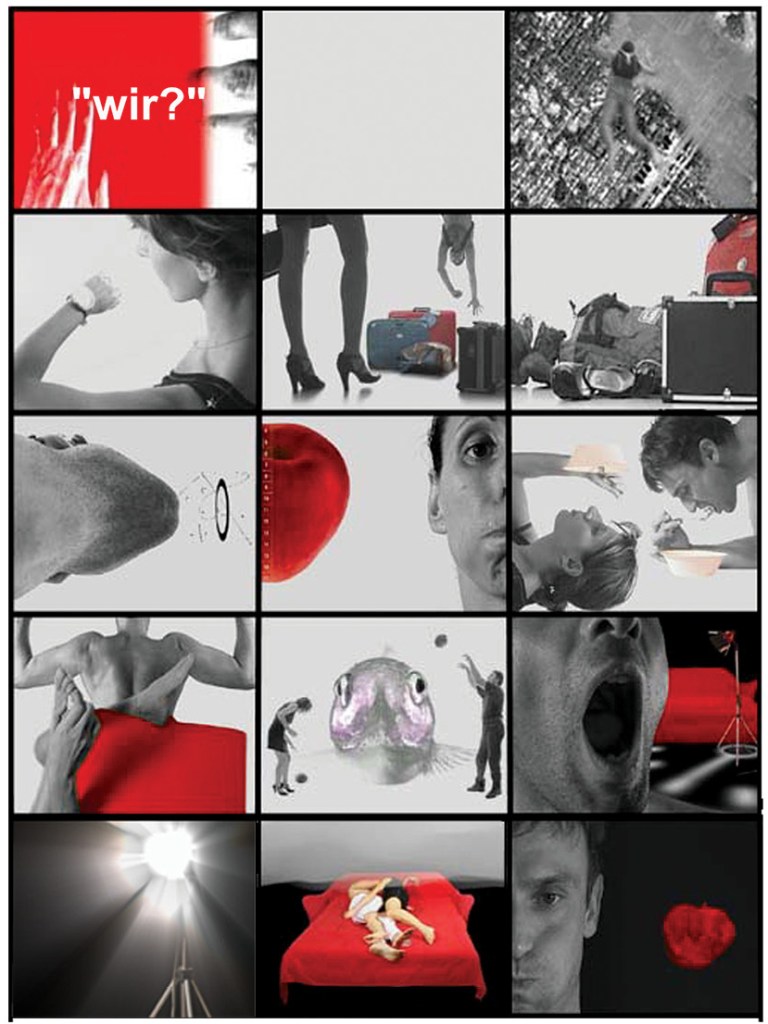 Σε ένα τρίπτυχο προβολών με τίτλο «wir?» (εμείς;), μέσα από εναλλασσόμενα θραύσματα εικόνων και ήχων, δημιουργείται μια κυκλική και ταυτόχρονα αποσπασματική αφήγηση γύρω από τη σχέση ενός ζευγαριού. Στο επιλεκτικά απογυμνωμένο από χρώματα και αντικείμενα τοπίο, κυριαρχεί μόνο το κόκκινο χρώμα.
