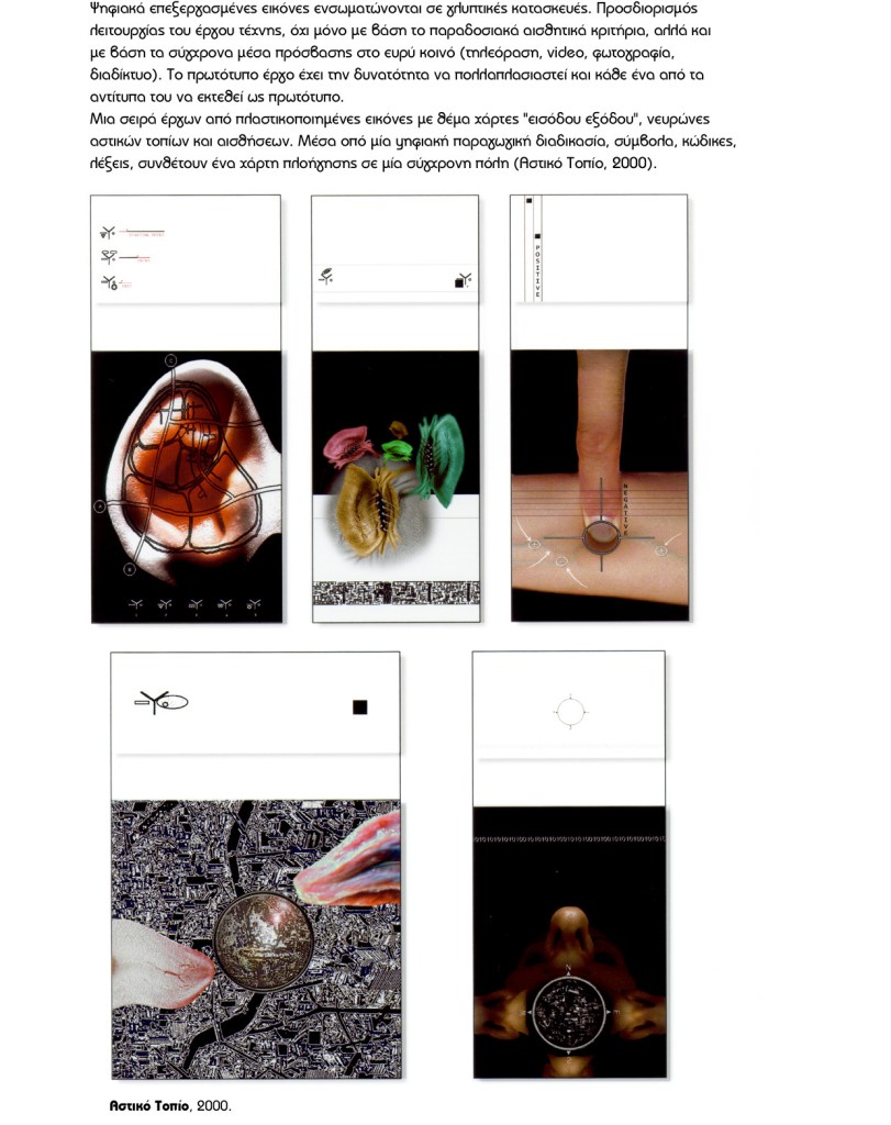 Σημεία αναχώρησης και προορισμοί, δρόμοι περάσματα – σημεία προοπτικής – διέξοδοι αδιέξοδα. Θέσεις μετέωρες που πολλές φορές ταυτίζουν την ακινησία με την κίνηση, την σιωπή με το θόρυβο στο νέο διαμορφωμένο τοπίο, όπου οι ουμανιστικές αξίες έχουν περάσει σε δεύτερη μοίρα. (παρουσιάστηκε στην BIENNALE1, Μπιενάλε Σύγχρονης Τέχνης Θες/νικης, «Ετεροτοπίες – Project Public Screen»)