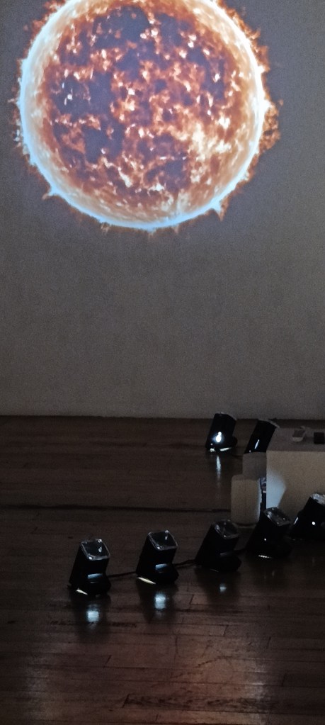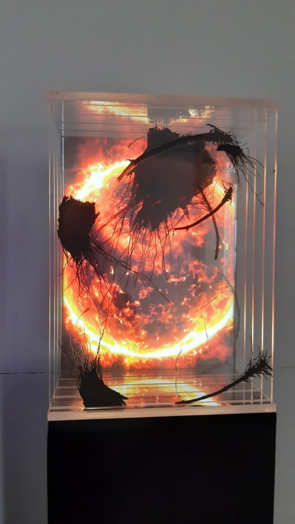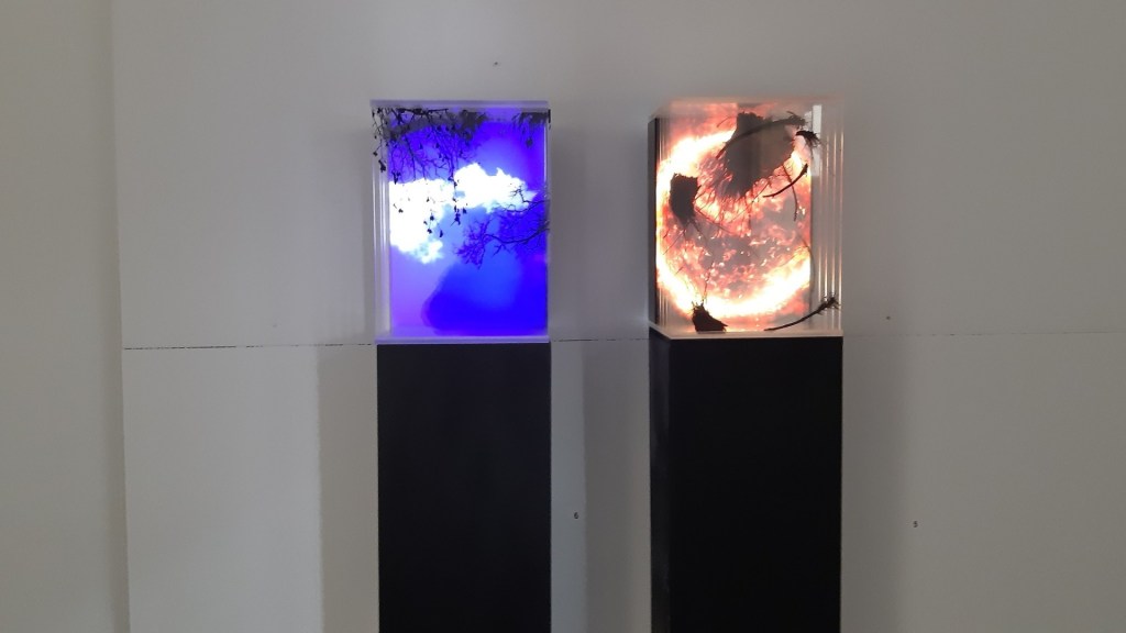 Τα έργα δημιουργούνται από διαφορετικές συνθέσεις τοποθετημένες με την λογική των layers και δημιουργούν οπτικές ψευδαισθήσεις. Αποτυπώνουν μια γραμμική timeline, όπου όλα τα γεγονότα συνέβησαν, συμβαίνουν ή θα συμβούν ταυτόχρονα. Το φως ως δομικό στοιχείο στα 4 έργα, παραπέμπει σε προβολές κινούμενης εικόνας. Τα έργα βασίζονται στην αναπαράσταση των στοιχείων της φύσης: Γη, Ουρανός, Νερό, Φωτιά