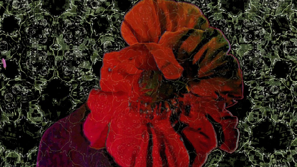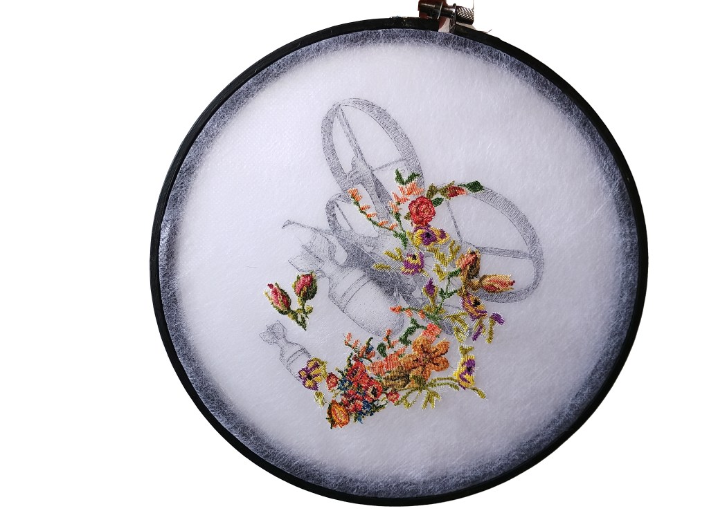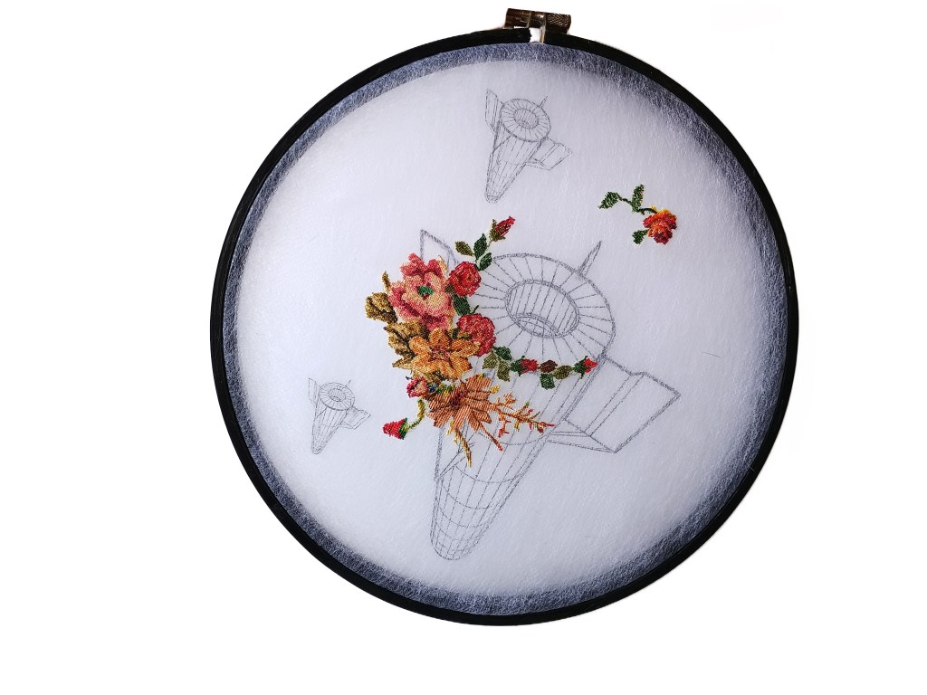 2024 “Λουλούδια πολέμου” (2024) εκτυπώσεις, κέντημα σε διαφανές χαρτοϋφασμα.