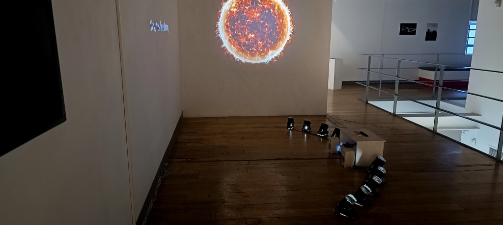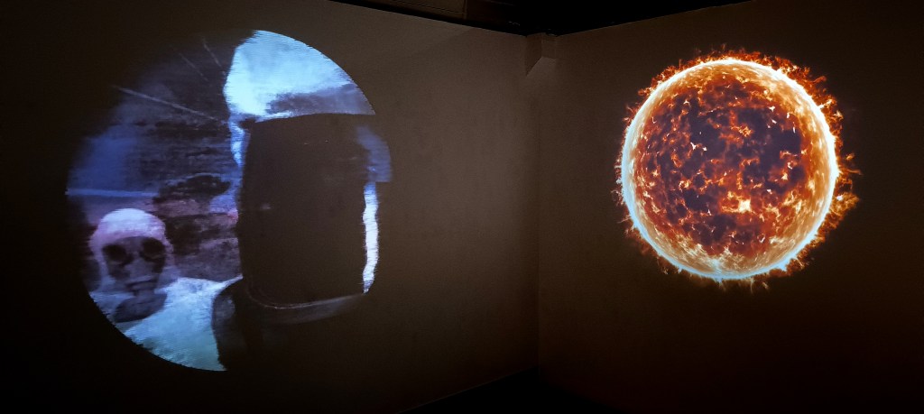 Στο αρχειακό υλικό το οποίο συνέλεξαν από το διαδίκτυο σχετικά με τις αναρίθμητες επανδρωμένες αποστολές στους διαστημικούς σταθμούς που βρίσκονται σε τροχιά γύρω από τη Γη και που οργανώθηκαν μαζικά κυρίως κατά την περίοδο του Ψυχρού Πολέμου, αποτελώντας το μέσο διεκδίκησης δύναμης και επιβολής στην αντιπαράθεση μεταξύ των δύο υπερδυνάμεων της εποχής, βασίζεται η βιντεοεγκατάσταση Bye bye blue Sky του Στέλιου Ντεξή και της Μυρτώς Βουνάτσου. Το έργο επικεντρώνει στις περιπτώσεις έκθεσης του ανθρώπινου σώματος στις ακραίες συνθήκες του διαστήματος, τονίζοντας την ευαλωτότητά του…….. (Δόμνα Γούναρη Επιμελήτρια της Έκθεσης κατ. MOMUS 2025, σελ 15)